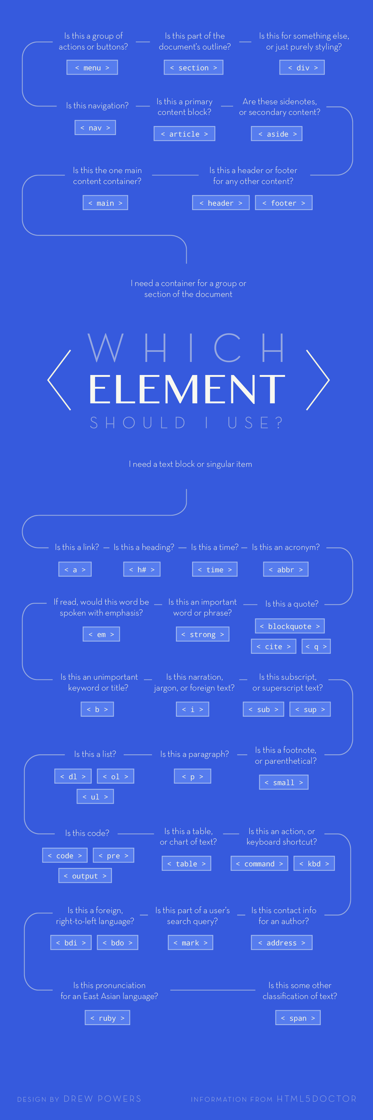 Not just any element will do; it has to be the right element for the job. Even though the web is changing fast, it’s important to know what things mean in 2014. I wanted to organize a flowchart simply for my own understanding, but I thought that publishing it would help other people out as well.